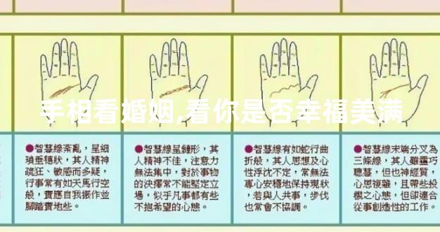 手相看婚姻,看你是否美满幸福呢?如果是,那么祝福你,或许你有这先天给予的优势,如果不是也不要害怕,相信爱情,相信婚姻。美满幸福的婚姻更多的是需要彼此不断的磨合出来的,需要经营出来的。当然看手相的目的是为了知天命,及时拥有不好的手相也不要惊慌,后天调理也很重要,可请相术老师