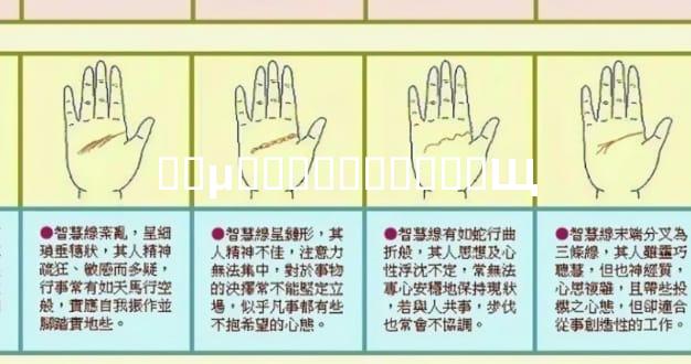 如果智慧线分叉,那么个性低调、温和。虽然人缘不错,但待人会有距离感。能吃苦,但好安逸。安全感差,内心追求稳定。事业线散,没事业心,但家境不错,适合居家,或做点小生意。感情线有眼纹,缘在远方,容易异地,感情受距离限制。另外正缘很少,烂桃花重。婚姻线高,短期没什么姻缘,婚姻线也浅,婚运晚,在27岁左右。感情上,你倾向成熟一些的异性,但目前多不成熟异性纠缠,暂时不谈是对的。事业运一般,你比较能吃苦,财运靠劳心劳力而来。